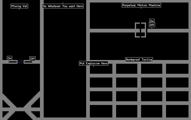 On The Left, is a chemical Compination Unit. On The Lower Right, is the barrier tests. Put an explosive or any other element on the left side, and see if it penetrates! And on the upper right corner is a purpetual motion machine. I hope you Enjoy!