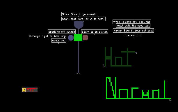 When the metal is heated over 100 C it will say HOT. Just cool the metal (NOT COOLING THE END) and spark again. Note:this was not to power something but to show you an idea on Powder Toy. You can`t copy/edit/use this without permission from PTI