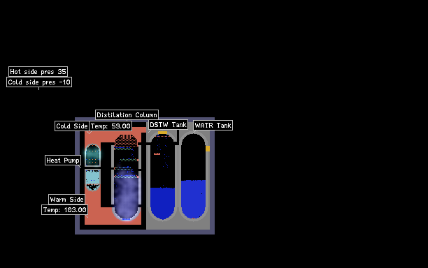 This simulation uses a heat pump sistem as an energy source to distilate water. The Cold side of the heat pomp is represented by the condenser at the top of the column, while the hot side is the reboiler at the base of the column have fun changing the pa