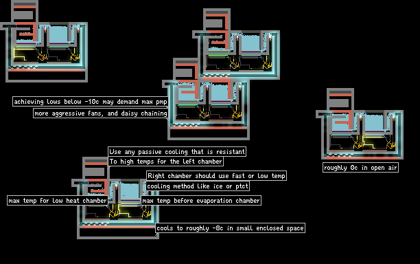 Apologies for brevity of description, in game text box has a limit. The top left chamber is intended to use cooling that is not likely to melt. The reason for this is when I have tried to make refrigerators in the past, I sometimes get runaway temperatures which propagate through the system and melt things. One solution is to use non melting cooling (like pcln + ln2 or HEAC + fans / pumps). However some of these are not satisfying or do not cool very fast at near room temperature. [1/2]