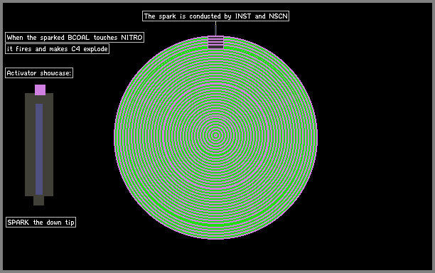 MASSIVE explosion: The spark, conducted by INST and NSCN, touches the BCOAL and fires it, then the BCOAL touches NITRO and it burns. When the NITRO touches C4, it explodes. Feel free to use it for whatever you want.
