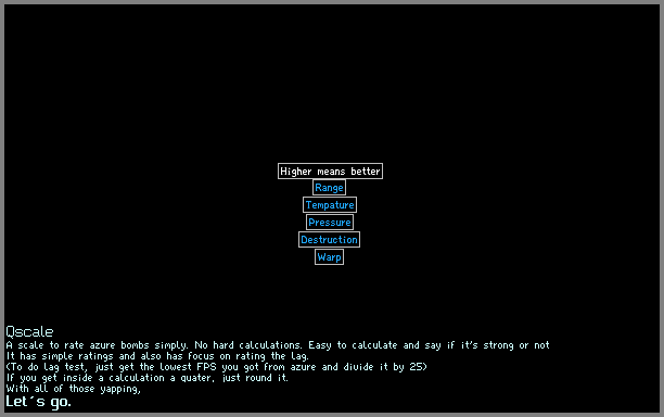 This scale has some technical issues. #1: I just completely maxxed this scale out with one of my Azurebombs. #2: on the tempature test, the FILT can be distorted by WARP(idk if that was intentional). #3: the WARP test sign is linked to the range test. Also, am I trying to get a higher score, or a lower score? This scale is easy to max out, because there is a point at which you can't get a better score. a scale like the K/K2-scale, there is no limit. So, that offers more potential.