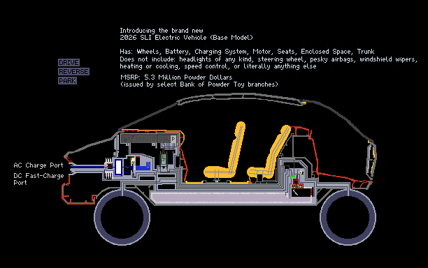 See select dealerships for purchase or lease. All rights reserves for trademark of Bank of Powder Toy. Charging stations to be built out by 2037.