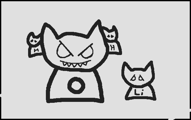 My H2O's Oxygen is tainted if bonded with 2 Hydrogens. It starts to target Lithium. It grows spiked teeth. Lithium is scared of the O in H2O. Credit to Miraheze for the inspiration and Mellowithyellow for their recreation of the Element Cattoes to TPT.