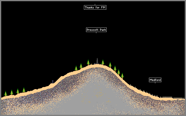 Roxy Ann peak is a butte in Medford, Oregon, in the southwestern part of the state. To the east, (right) the suburban outskirts of Medford are visible. At the peak, Prescott Park can be seen. It even has a radio tower!