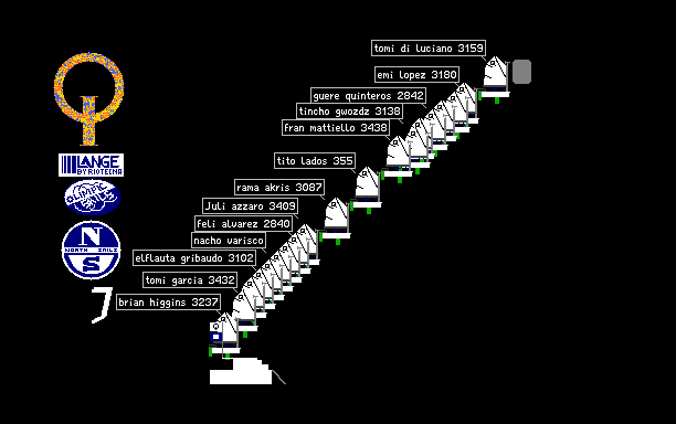 a race start of optimist internacional sailing class whith sponsors, logo and realistic boats.